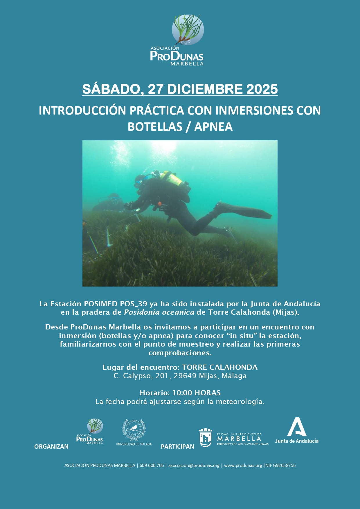 Desde ProDunas Marbella organizamos un encuentro práctico con inmersiones (botellas y/o apnea) con el objetivo de conocer in situ la estación, familiarizarnos con el punto de muestreo y realizar las primeras comprobaciones técnicas, siguiendo la metodología establecida.